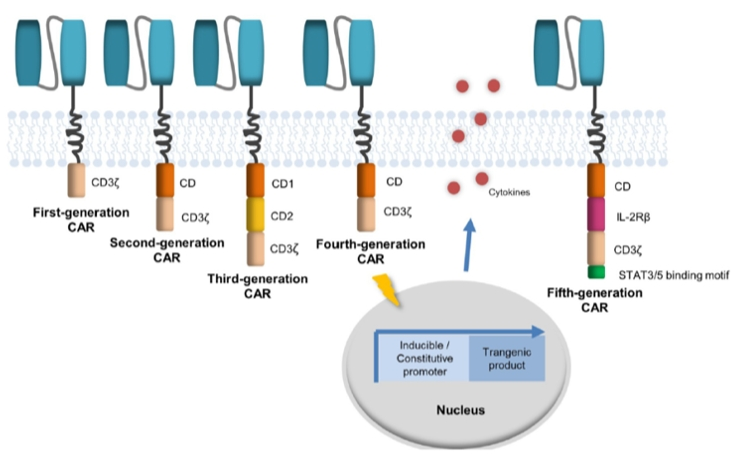 CAR-T细胞免疫疗法是一种新型的治疗方法,它利用患者自身的免疫系统来对抗癌细胞,简单来说是将分离所采集的患者外周血中的T细胞,顺利获得基因转导技术使分离出的T细胞表达CAR,而后再将这些细胞回输到患者体内进行抗肿瘤治疗。CAR由来自单克隆抗体的单链可变片段(scFv)、来自CD8的铰链区、跨膜结构域和细胞内信号传导域四部分组成(图1)。第一代CAR仅包含一个细胞内信号传导域,第二代加入了共刺激结构域如CD28或4-1BB等,以增强CAR-T的抗肿瘤效应。第三代在第二代的基础上进一步将共刺激结构域增加至两个,以促进CAR-T的增殖和活化。第四代在第三代的基础上又增加了细胞因子,以提高CAR-T对肿瘤的杀伤力。有研究者开发了一种新型CAR构建体,这种新一代 CD19 CAR 编码来自白细胞介素(IL)-2受体β链(IL-2Rβ)的截短细胞质结构域和 STAT3 结合酪氨酸-X-X-谷氨酰胺 (YXXQ) 基序,以及TCR信号转导(CD3ζ)和共刺激(CD28) 结构域,这被认为是第五代CAR[2],虽然这一概念现在处于探索阶段,但与单独表达CD28或4-1BB共刺激结构域的CAR-T细胞相比,该构建体在血液瘤和实体肿瘤模型中表现出优异的体内持久性和抗肿瘤作用,为治疗实体瘤带来了希望。CAR-T输注入患者体内后,可以特异性识别并顺利获得细胞溶解、释放细胞因子和Fas/FasL三种途径杀死表达特异性抗原的肿瘤细胞,且不受主要组织相容性复合体(Maior histocompatibility complex,MHC)的限制。