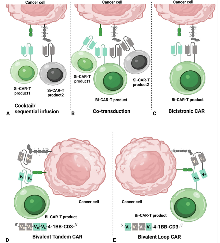 从理论上讲,双特异性CAR-T细胞可以顺利获得以下四种方式实现[7-9]:1)如图3A,Cocktail/Sequential infusion,即单特异性CAR-T细胞联合治疗(也就是鸡尾酒疗法)。这种联合治疗的弊端是两种不同靶点的CAR-T细胞在体内的扩增速率不同,最终会导致两种CAR-T细胞的比例失调,不能更好地清除肿瘤细胞;2)如图3B,Co-transduction,即两种病毒载体分别编码一种单特异性CAR分子,再将这两种病毒共同转导T细胞形成双特异性CAR-T细胞。但由于转导效率的不同,这种办法构成的CAR-T细胞上两种CAR分子的比例是不均衡的,且也会出现T细胞上仅表达一种CAR分子的情况;3)如图3C,Bicistronic CAR-T细胞,即使用一种病毒载体编码两个单特异性的CAR分子,使CAR-T细胞上有两种CAR分子。这种方法构建的双特异性CAR-T细胞可以靶向两种抗原且这两种CAR分子的比例是相等的。但这种方法的弊端是病毒载体载量有限。病毒同时编码两个CAR分子的效率较低,导致CAR-T细胞上CAR分子表达量较低且第二个CAR分子的表达可能不完整;4)如图3D-E,Bivalent CAR-T细胞,即一个病毒编码一个CAR分子,这一个CAR分子上含有两个抗原结合位点。Bivalent CAR-T细胞的结构又可以分为两种形式:线性串联(Tandem)或环状(Loop)构型。这两种bivalent CAR是现在研究最火热和应用最多的双特异性CAR-T细胞构型。