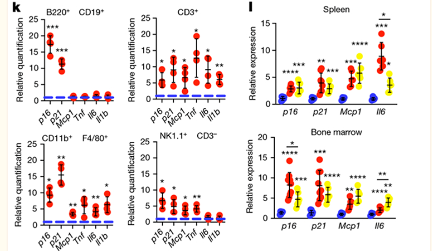 反之,将年轻健康小鼠的免疫细胞回输给衰老小鼠,一个月后检测,发现相关的衰老标志物水平显著减少,小鼠体内多处的组织和器官的衰老发生逆转。这证实了年轻的免疫细胞可一定程度逆转衰老小鼠的衰老。