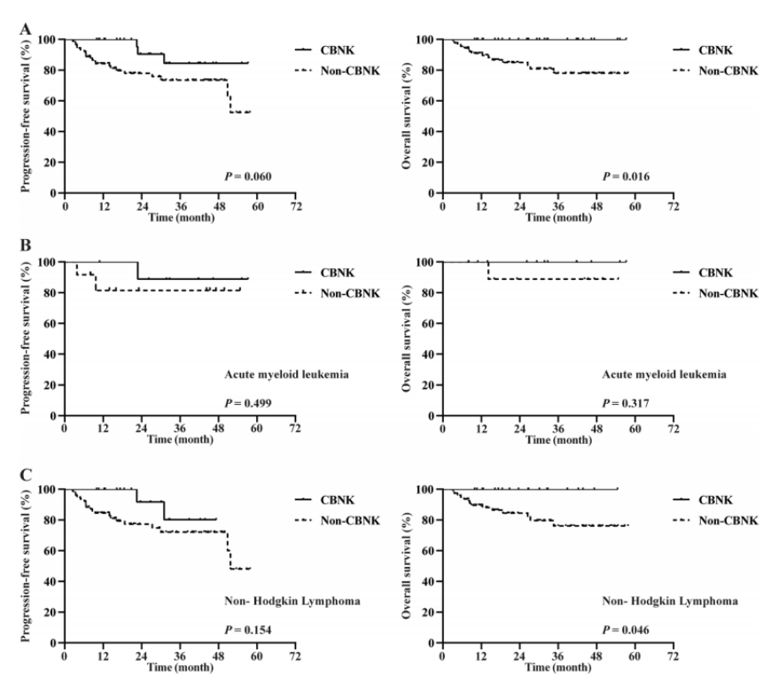 (图6 输注CBNK细胞与无输注患者的无进展生存期和总生存期对比)
